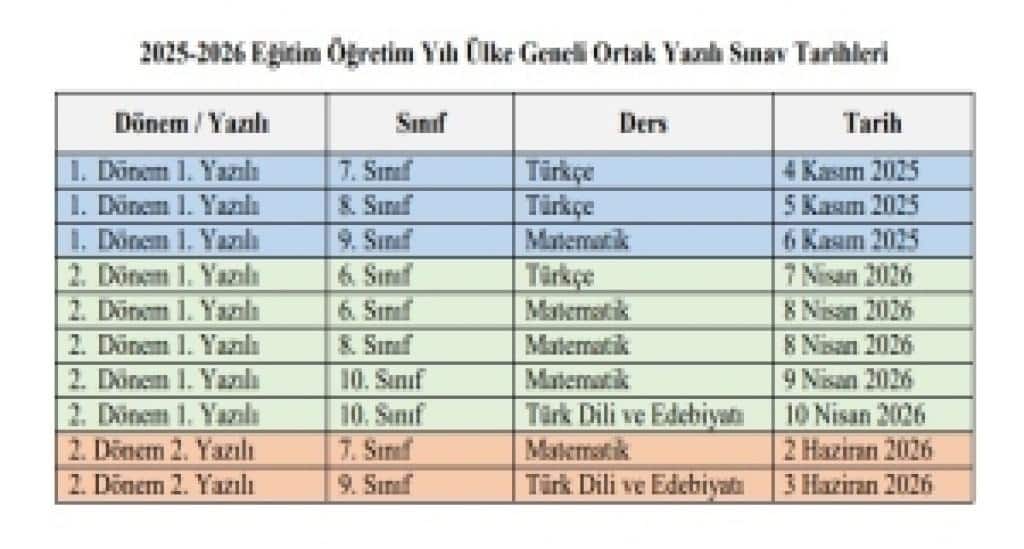 İlk kez 2023-2024 eğitim öğretim yılında gerçekleştirilen ülke geneli ortak yazılı sınavların başarılı sonuçlar vermesi üzerine, yeni eğitim öğretim yılında da ülke geneli ortak yazılı sınavlar yapılacak. 2025-2026 eğitim öğretim yılına ilişkin belirlenen ortak yazılı sınav takvimine göre, yeni eğitim öğretim yılında 6, 7, 8, 9 ve 10. sınıf düzeylerinde ülke genelinde toplam 10 ortak yazılı sınav yapılması planlanıyor. Yayımlanan takvime göre 1. dönem 1. yazılı sınavları Kasım 2025'te; 7. sınıf Türkçe dersi için 4 Kasım Salı, 8. sınıf Türkçe dersi için 5 Kasım Çarşamba, 9. sınıf matematik dersi için 6 Kasım Perşembe günü gerçekleştirilecek. 2. dönem sınavları 1. yazılı sınavları Nisan 2026'da; 6. sınıf Türkçe dersi 7 Nisan Salı, 6. sınıf ve 8. sınıf matematik dersi 8 Nisan Çarşamba, 10. sınıf matematik dersi 9 Nisan Perşembe ve 10. sınıf Türk dili ve edebiyatı dersi için 10 Nisan Cuma günü yapılacak. 2. dönem 2. yazılı sınavları ise Haziran 2026'da; 7. sınıf matematik dersi için 2 Haziran Salı, 9. sınıf Türk dili ve edebiyatı dersi için 3 Haziran Çarşamba günü uygulanacak. Bu sınavlarda kullanılacak açık uçlu sorular, öğrencilerin konuyu ne kadar anladığını ortaya koymanın yanı sıra, öğretmenlerin öğrencilere nasıl geri bildirim vereceği ve öğrenme sürecinin nasıl şekilleneceği konusunda da önemli veriler sağlayacak. Bu uygulama ile öğretmenler, sınıf ortamında öğrencilerin gelişimini daha yakından izleyebilecek; ülke genelindeki sınav sonuçları ise akademik başarı seviyelerinin değerlendirilmesine olanak tanıyacak.